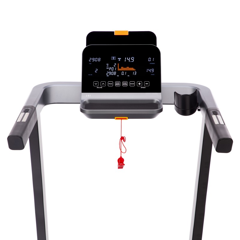 Bieżnia BE5873 posiada komputer z wyświetlaczem LCD, oferującym aż 36 gotowych programów treningowych, 3 programy użytkownika oraz 1 manualny. Wbudowane sensory do pomiaru czasu, odległości, prędkości, kalorii, pulsu oraz funkcja analizy tkanki tłuszczowej (Body Fat) pomagają monitorować postępy i dopasować intensywność ćwiczeń do indywidualnych potrzeb. Sterowanie prędkością i nachyleniem na uchwytach pozwala na szybkie i wygodne dostosowanie parametrów treningu bez przerywania ćwiczeń.